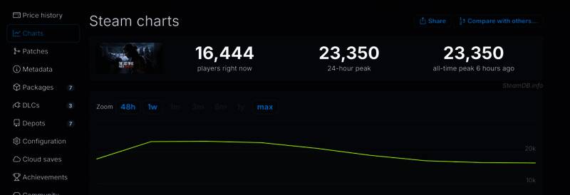 《最后的生还者2:重制版》Steam首发同时在线峰值为23350人,当前在线16444人: