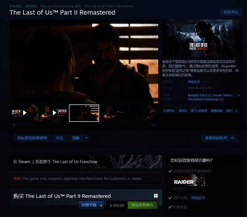 《最后的生还者2:重制版》现已登陆PC平台发售,Steam国区345元,支持简体中文。该作在Steam上已经获得近千条(939篇)评价,好评率为92%,总体为“特别好评”。