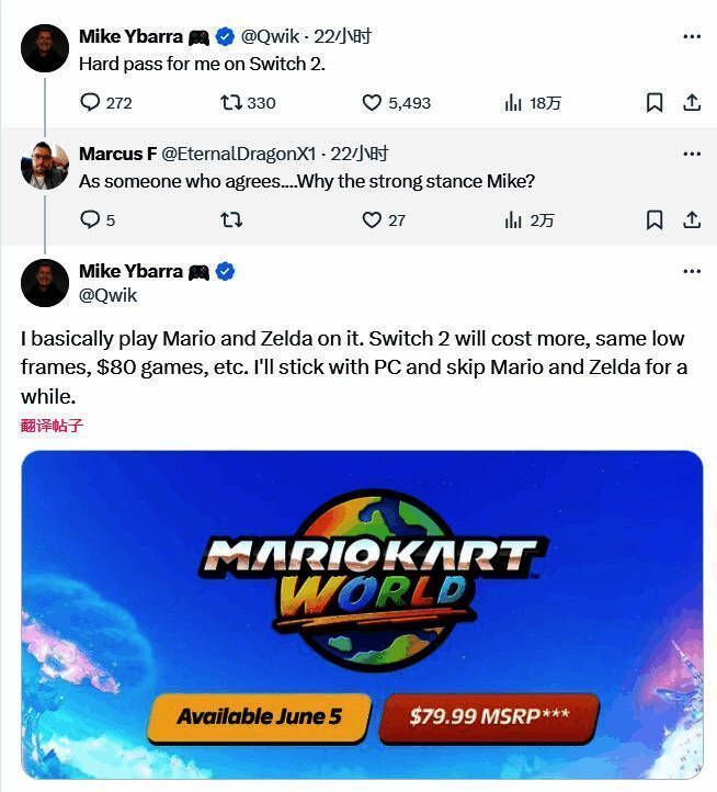 Mike Ybarra发推称,他个人很难接受Switch 2主机。在回答网友提问时,他给出了解释:“我在Switch 2上基本上只玩《马里奥》和《塞尔达传说》。Switch 2花的钱更多了,但还是同样的帧数,而且游戏高达80美元。我还是玩PC吧,暂时不玩《马里奥》和《塞尔达传说》了。”