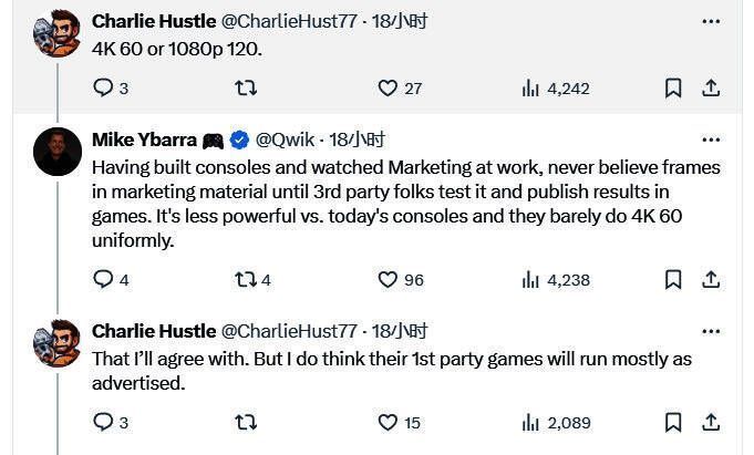 当被追问Switch 2支持4K/60FPS和1080P/120FPS时,Mike Ybarra表示他本人在微软时也亲身经历过打造主机,也懂得市场营销,“在第三方机构测试前,永远不要相信官方的宣发帧数。Switch 2的机能实际上还不如当今的主机,而当今的主机连4K/60帧也基本上做不到。”