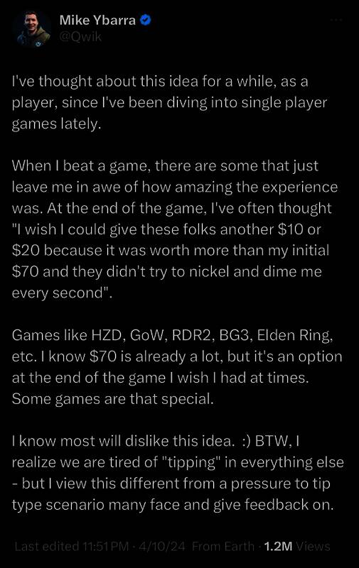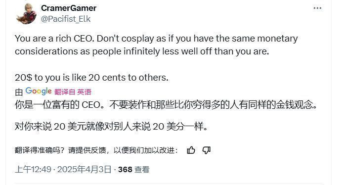 也有玩家列出了他之前发的推文,他在推文中称自己被一些3A大作惊艳到,在购买游戏后突发奇想地想打赏这些开发者10-20美元,以赞助这些游戏。