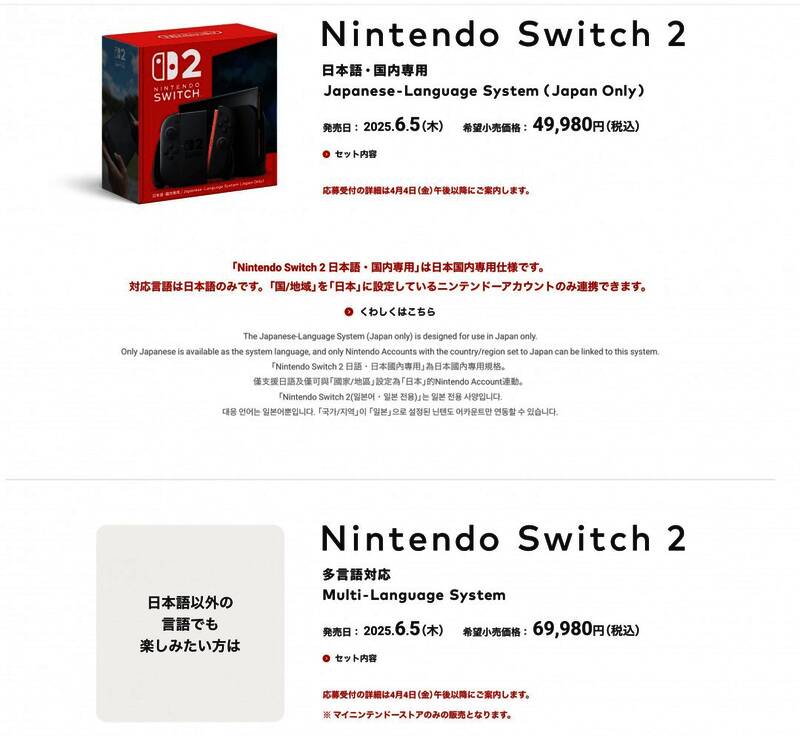 日本国内专用版售价49980日元(约合人民币2498元),多语言版69980日元(约合人民币3498元)。对比来说,2017年的1代Switch在日首发为32378日元(含税)。Switch 2的首发价格贵了54%。