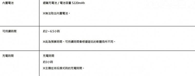 电池续航时间约为2-6.5小时。根据游戏软件的不同,持续时间会有所变化。相比之下,Switch续航时间为4.5-9小时、Switch OLED版续航时间为4.5-9小时,Switch Lite续航时间为3-7小时。