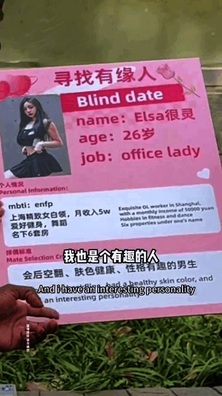 广告中这名26岁的“上海精致女白领(office lady)”月入5万,名下6套房,择偶标准是“会后空翻,肤色健康,性格有趣的男生”,似乎是为会后空翻的甲亢哥“量身定制”。