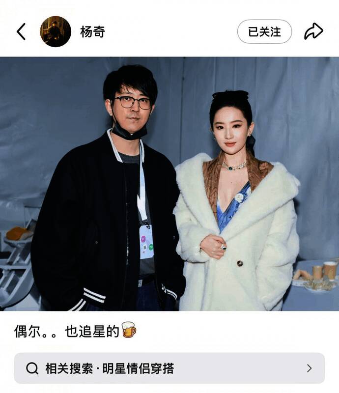 近日《黑神话:悟空》主美杨奇在小红书上上分享了自己和著名影星刘亦菲的合照,并配文:“偶尔。。也追星的””。