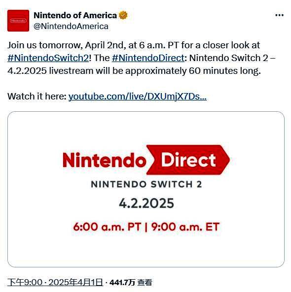 备受期待的任天堂Switch 2专场发布会将于北京时间4月2日晚上9点正式开启,根据美国任天堂的最新推文透露,该发布会将持续约一个小时,也就是从晚上9点持续到晚上10点。