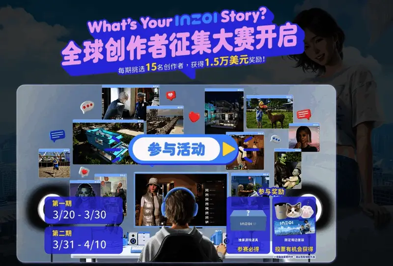 除了观看,玩家也可参与“What’s Your inZOI Story?”全球创作者征集大赛活动。该活动将于2025年3月20日至4月16日举行,参加者完成指定任务后即有机会成为获胜者,赢取1.5万美元奖励,同时参与投票的玩家也将有机会获得奖励。