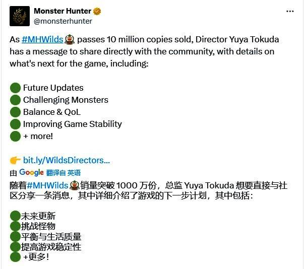 卡普空为《怪物猎人:荒野》公布了2025年上半年的免费更新路线图,与此同时游戏总监德田优也(Yuya Tokuda)与玩家社区共同庆祝游戏销量突破1000万份。