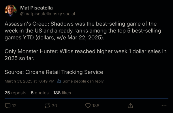 2025 年第一季度正式结束,销售数据也已统计完成。根据游戏市场数据分析机构 Circana 的分析师 Mat Piscatella 称,育碧于 3 月推出的《刺客信条:影》是 2025 年至今最畅销的前五名游戏之一。