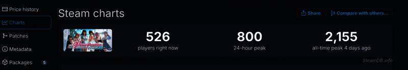 根据Steamdb,《维纳斯璀璨假期:死或生Xtreme》Steam同时在线峰值仅2155人,24小时峰值800人,当前在线526人。