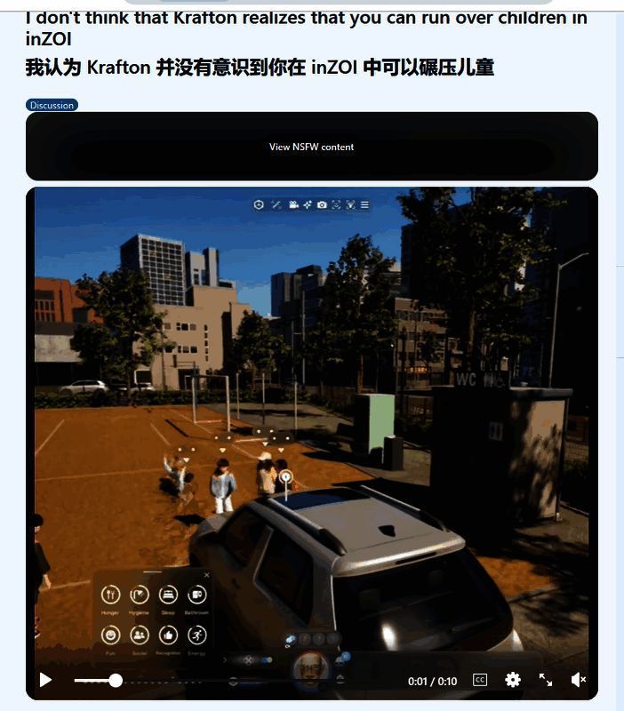 该bug的发现是有人在《inZOI》的Reddit帖子上发了一个名为“我不认为Krafton有意识到你在《inZOI》里可以用车碾死孩子”的帖子,这个帖子迅速流传开来,并引起玩家们热议。