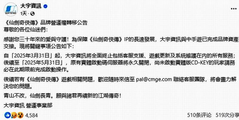 近日大宇资讯官方在脸书上发文称,已与中手游完成《仙剑奇侠传》IP资产交接。从3月31日起,包括客服支持、游戏更新及系统维护在内的服务将终止。2025年5月31日后,原有实体激活码服务器将永久关闭。