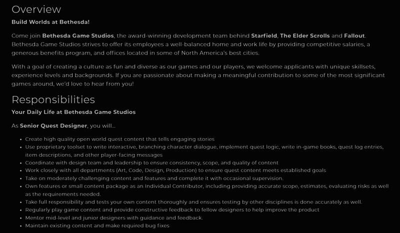 最近B社发布高级任务设计师和助理任务设计师职位招聘,要求应聘者对开放世界游戏很熟悉,拥有开发3A游戏的经验,最好玩过《上古卷轴5》。他们的工作是使用专有工具创建开放世界内容,讲述引人入胜的故事和分支对话。