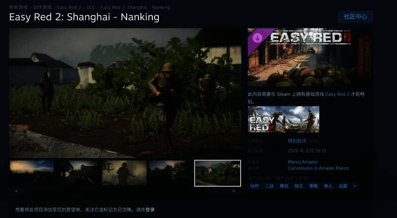 “淞沪会战-南京保卫战”DLC需要购买本体游戏《浅红2》才能游玩,最近评价“特别好评”,479篇评价中好评率为96%。