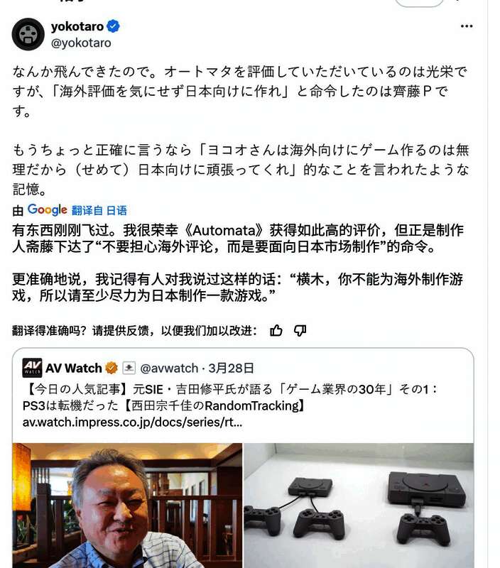 横尾表示:“突然收到这么个消息。我很荣幸《尼尔:机械纪元》获得如此高的评价。不过,【别管海外评价,专心做给日本市场】的命令可是齐藤下的。