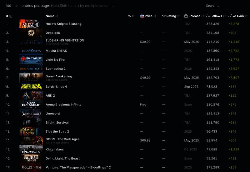 根据SteamDB,《光与影:33号远征队》在Steam上的愿望单排名仅位列第32名,有49274人将其加入了愿望单,不到5万人。过去7天有超过2000人将其加入了愿望清单。