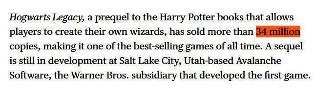 根据彭博社消息,作为《哈利波特》小说前传的游戏《霍格沃茨之遗》,其累计销量已经超过了3400万套,是有史以来最畅销的电子游戏之一。