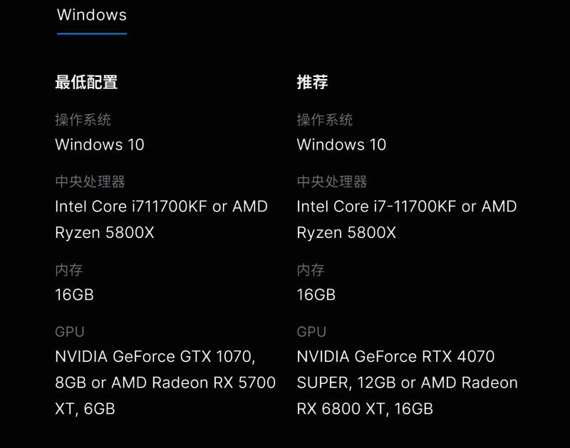 《烈焰之刃》PC配置如下,推荐RTX 4070/RX 6800XT显卡: