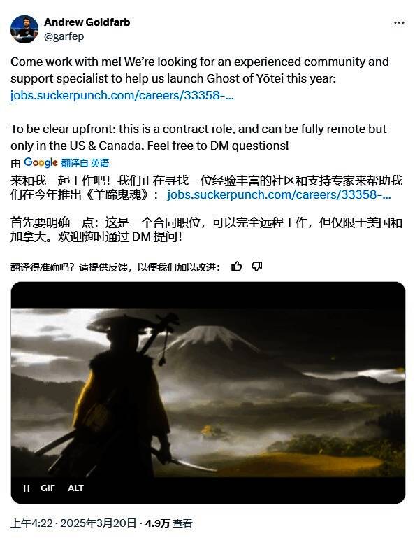 这一消息来自Sucker Punch高级传播经理Andrew Goldfarb。最近他在X平台发布招聘信息,表示工作室正在寻找有经验的社区运营专员协助游戏发售工作。最关键的是,他明确提到“开发团队仍计划在今年推出《羊蹄山之魂》”。