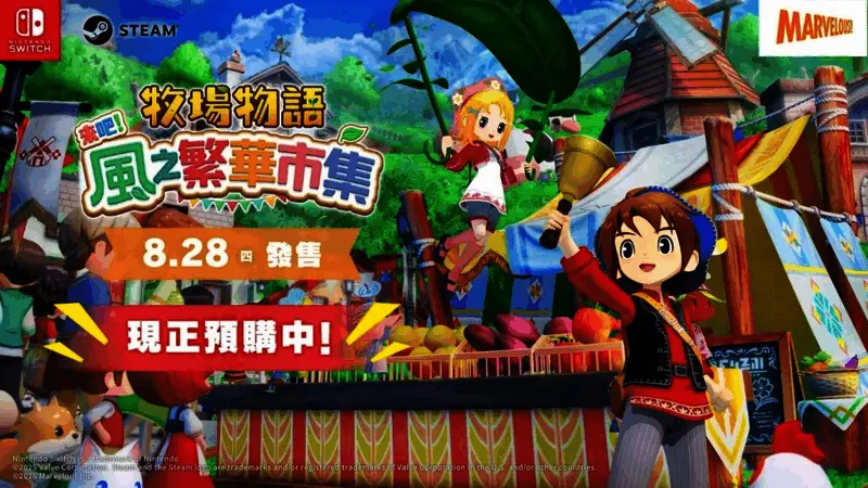 [2025年3月18日,香港]Game Source Entertainment (GSE)宣布,由Marvelous Inc. 开发及发行的温馨生活游戏《牧场物语》系列最新作品,《牧场物语来吧!风之繁华市集》将在2025年8月28日(周四),于Nintendo Switch™及Steam®平台正式发售,并由GSE负责代理Nintendo Switch™盒装版本,各位敬请期待!