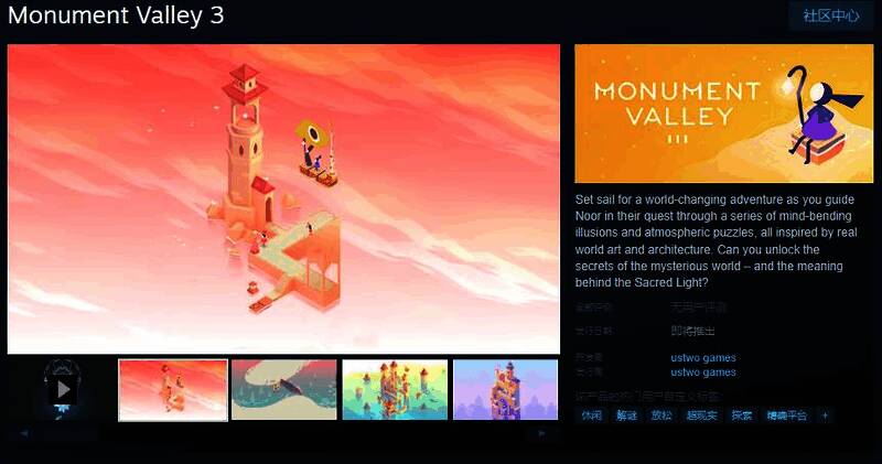 今日(3月28日),益智游戏《纪念碑谷3》Steam页面公布,2025年夏季发售,支持繁体中文,感兴趣的玩家可以点击此处进入商店页面。