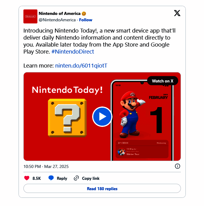 现在玩家可以通过苹果应用商店和谷歌Play下载“Nintendo Today”应用,只要有任天堂账户就可以登录使用。