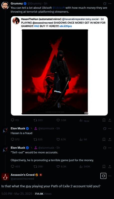 本月26日,推主Grummz发布了一条帖子,批评育碧大撒钱给支持“恐怖主义”的主播Hasan Piker以宣传他们的《刺客信条:影》游戏。