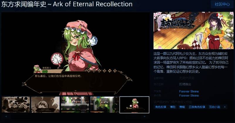 今日(3月27日),《东方求闻编年史~Ark of Eternal Recollection》Steam页面上线,发售日待定,支持简体中文,感兴趣的玩家可以点击此处进入商店页面。