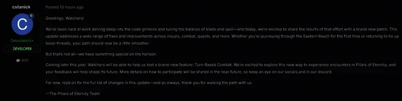 “今年晚些时候,观察者将能够帮助我们测试一项全新功能:回合制战斗。我们很高兴探索这种体验《永恒之柱》遭遇战的新方式,您的反馈将有助于塑造它的未来。有关如何参与的更多详细信息将在不久的将来分享。”