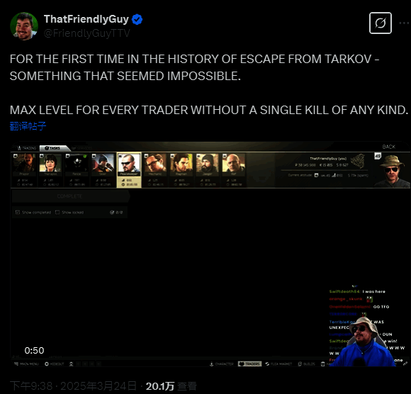 ·别人在狂卷互相伤害,但是游戏主播ThatFriendlyGuy却主打在游戏中“温和散心”,正如同他的名字一样,积极的以所有玩家成为好友为目标,也包括NPC,日前挑战不杀一人而且同游戏中的总共9位交易师全部达成最高信任度目标,