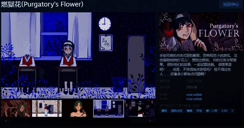 今日(3月27日),手绘风格指向点击恐怖冒险游戏《燃獄花》Steam页面开放,2025年发售,游戏支持简繁体中文,感兴趣的玩家可以点击此处进入商店页面。