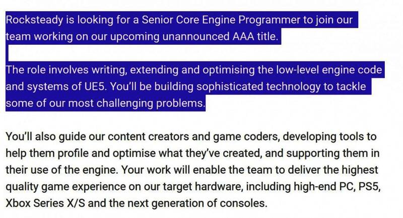 外媒Tech4gamers发现Rocksteady发布了一个高级核心引擎程序师职位,职位中提到Rocksteady正在开发一个未公布的3A游戏,将直接使用虚幻5的底层引擎代码和系统。