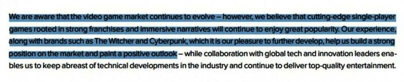 CDPR在财报中写道:“我们知道电子游戏市场会继续进化,然而我们相信扎根于强大系列和沉浸式叙事的顶尖单人游戏,将继续大受欢迎。我们的经验以及我们的品牌,比如《赛博朋克》《巫师》,这两个系列我们当然也乐于继续开发,将会帮助我们建立在市场上的强有力地位,勾勒一副美好的前景。”
