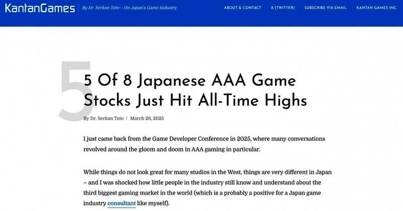 根据行业分析师Dr. Serkan Toto最近的报道,日本8家游戏厂商已有5家的股票在过去几周创下新的记录。