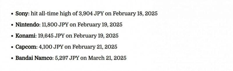 在其“Kantan Games”博客中,这名分析师解释说索尼的股价在今年2月18日来到历史新高,达到3904日元。此外,还有任天堂(11800日元)、科乐美(19645日元)、卡普空(4100日元)和万代南梦宫(5297日元)。