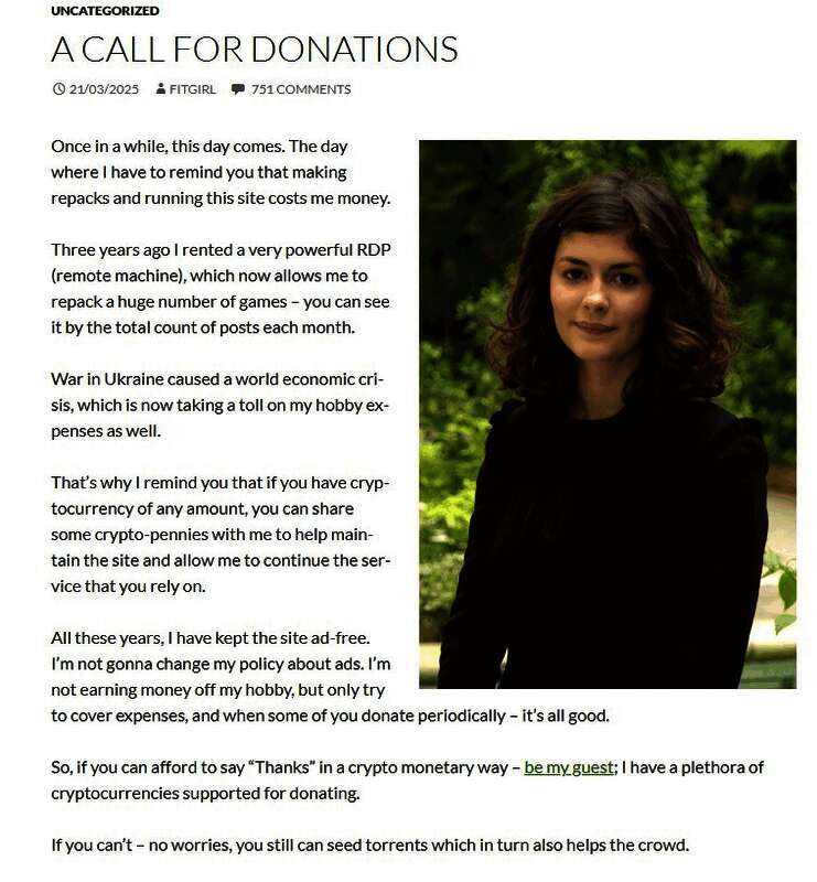 FitGirl Repacks是一家著名的游戏盗版网站,该网站以高压缩游戏文件和无广告免费下载为特色。最近FitGirl Repacks发布公告,向用户请求捐款以维持网站运营。