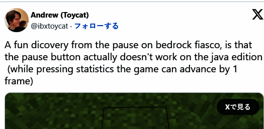 ·官方给出了问题的原因,因为基岩版要照顾跨平台游玩的特性,属于当年的基核问题,至于为什么隔了8年才修复的真正原因就不明了,总之,迟来的暂停还是极好的。