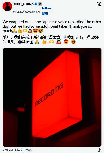 小岛秀夫一贯喜欢使用高概念的表达方式。相比之下,这次只是简单表述游戏日语对白已全部录制完成的消息,反而显得格外低调。