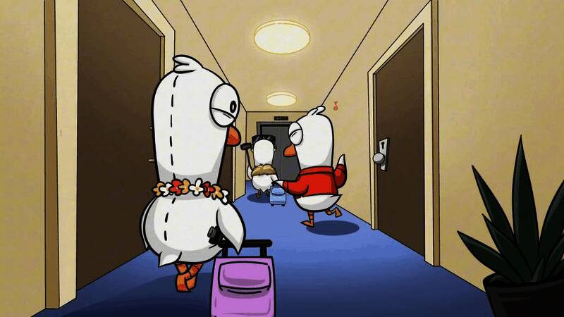 亲爱的鹅旅客们,这里是机长广播。您乘坐的飞船即将起飞,本次航班的目的地为中国。请注意您身边的乘客以确保旅途安全。飞行过程中如遇到突发情况,请根据地图指引,前往会议室按下红色呼叫按钮。我们将会竭诚为您服务。祝您旅途愉快。