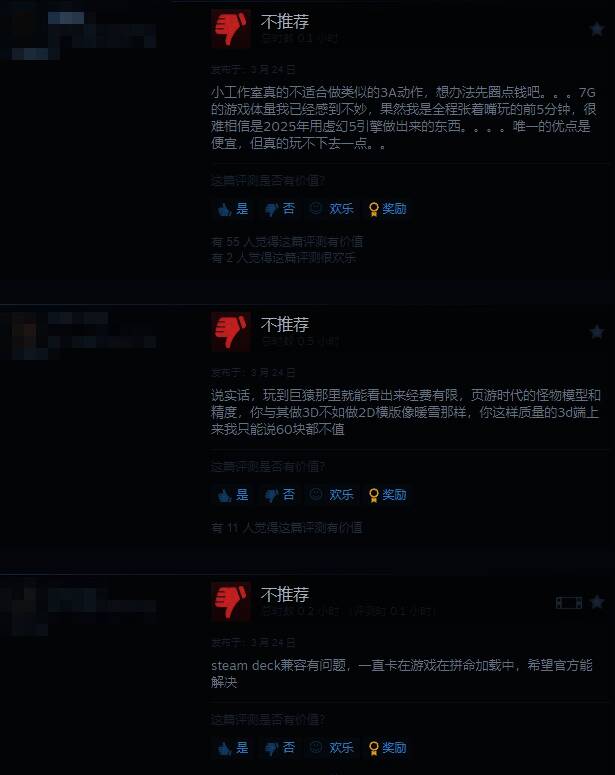给予差评的玩家认为游戏没怎么优化,部分BOSS战AI有点问题,战斗交互判断有延迟,剧情打斗声音单一等等。