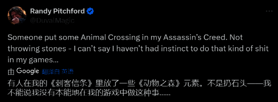 他在推特上表示:他非常喜欢新发布的《刺客信条:影》,特别是藏身之所的建造功能,里面加入了一些《动物森友会》的元素,并表示自己“无法否认”在一些游戏中也有类似的冲动想要加入这些东西。毕竟《无主之地4》快要发售,这段发言或许就是暗示其粉丝会在其中看到这种新玩法。