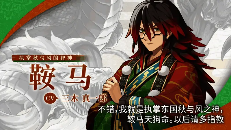 「不错,我就是执掌东国秋与风之神,鞍马天狗命。以后请多指教。」