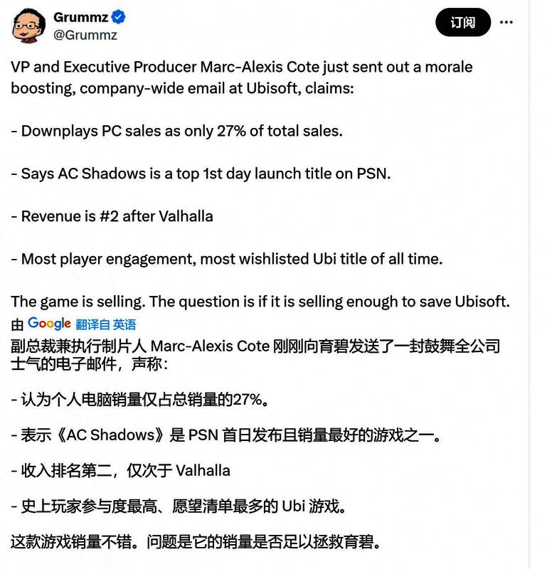 外媒VGC援引内部人士透露的销量数据,《刺客信条:影》是该系列史上首发第二高的游戏,仅次于《刺客信条:英灵殿》。