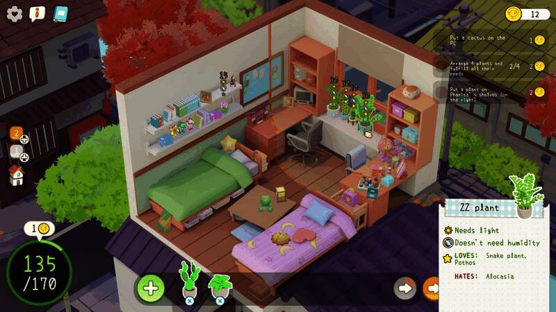 本作中,玩家将使用赏心悦目的植物让普通公寓焕发蓬勃绿意。在你的小公寓里为每株植物找到最佳摆放位置,尽享园艺之趣。另外,别忘了抚摸猫咪哦。