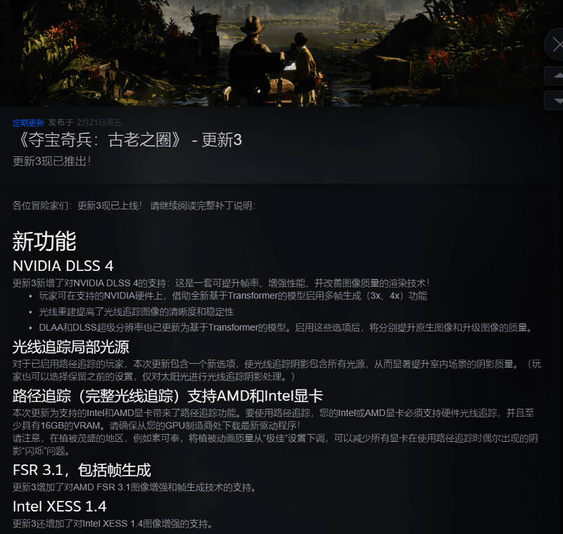《夺宝奇兵:古老之圈》最近一次更新是在今年2月21日,名为“更新3”的补丁为游戏加入了DLSS 4、FSR 3.1(含帧生成)和英特尔XESS 1.4技术。DLAA和DLSS超级分辨率已更新为基于Transformer模型,RTX 50系玩家可基于Transformer的模型启用多帧生成(3x、4x)功能。
