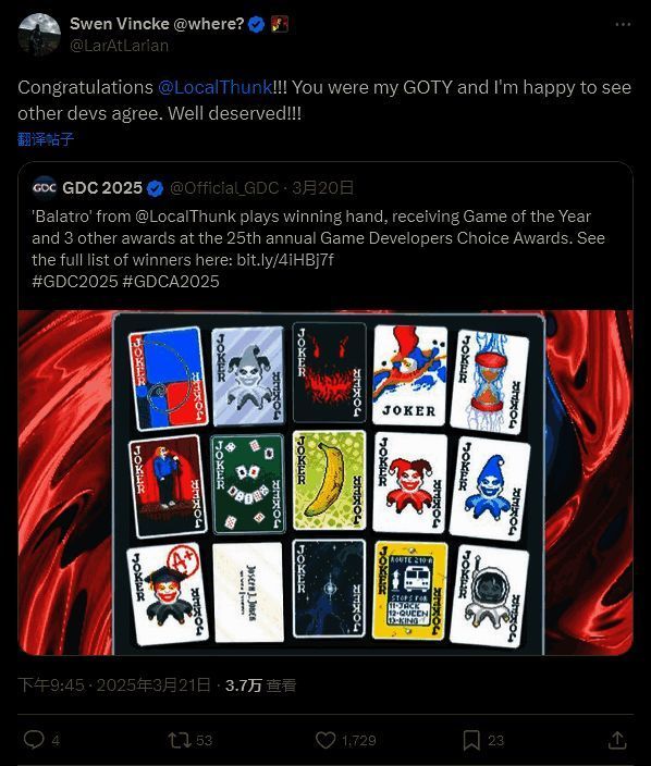 在推特上 Vincke 写道:“恭喜 LocalThunk!!!这也是我的年度游戏。我很高兴看到其他开发者也这么认为。当之无愧!!!”