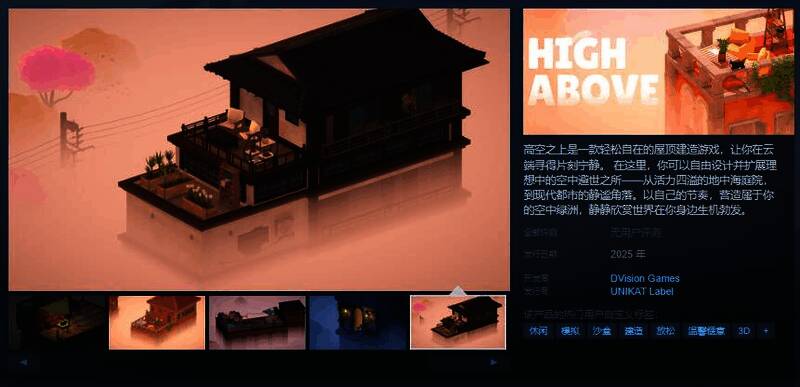 今日(3月21日),轻松治愈的屋顶建造游戏《高空之上》Steam页面公布,2025年发售,游戏支持简体中文,感兴趣的玩家可以点击此处进入商店页面。