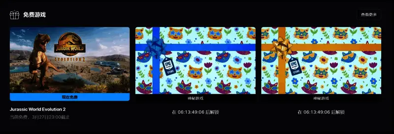 Epic商店本周免费送一款游戏,玩家可以免费领取模拟游戏《侏罗纪世界:进化2》。领取时间截至3月27日23:00,用户只要登陆Epic商店领取游戏,就可永久保存到游戏库中。