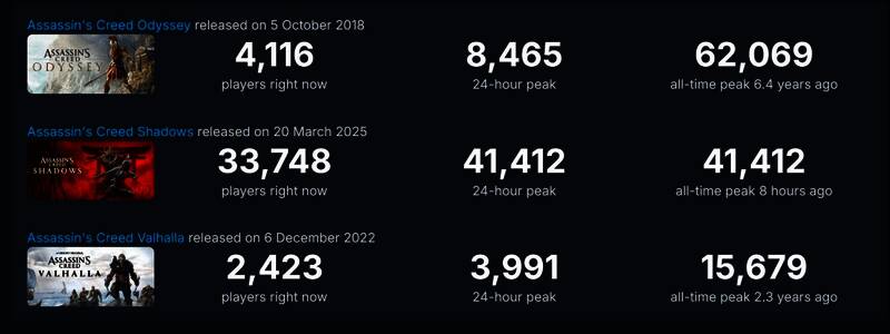 《刺客信条:影》Steam首发在线峰值41412人,不敌6年前的《刺客信条:奥德赛》,后者Steam在线峰值62069人。