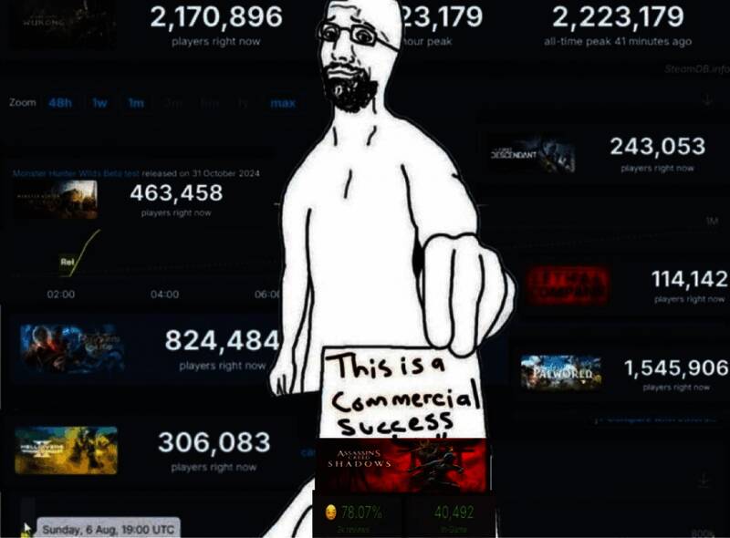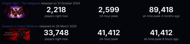 如果拿近期扑街的同样正确大作《龙腾世纪:影障守护者》对比,《刺客信条:影》Steam在线峰值甚至不及前者,前者的Steam首发在线峰值接近9万人(89418)。
